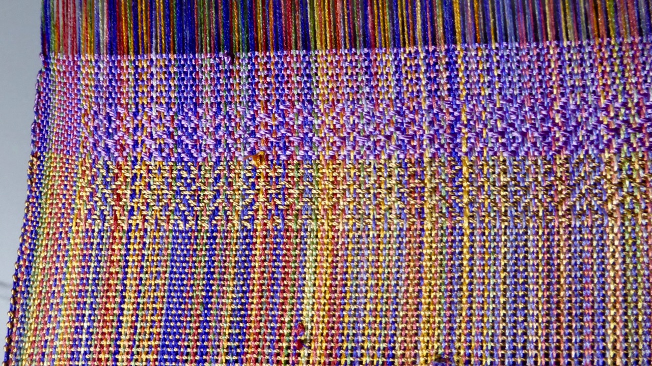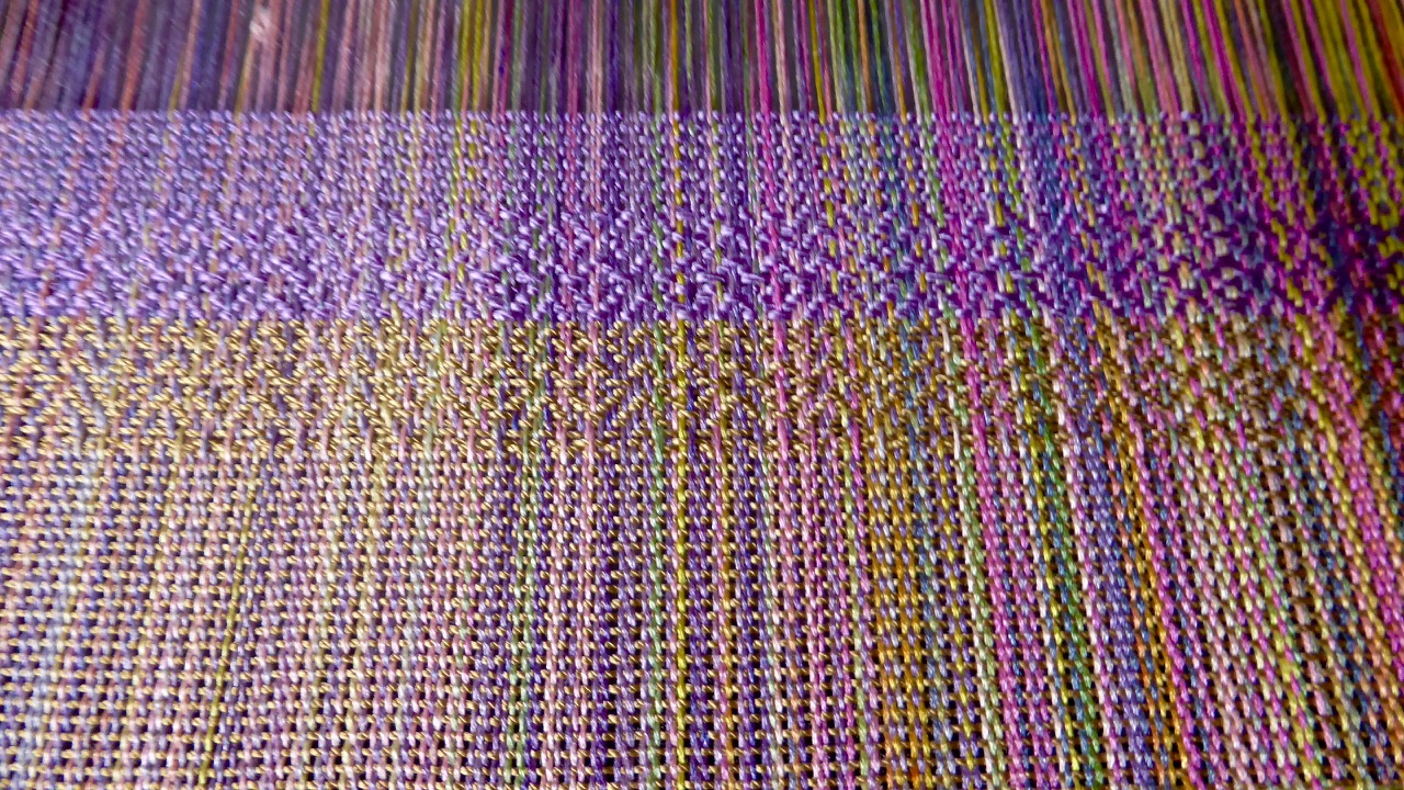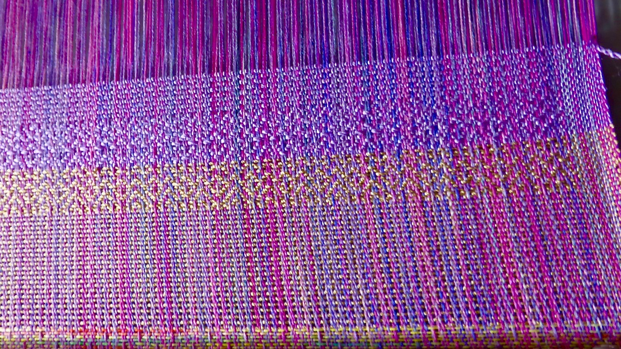 So, let’s start with plain weave and hearts weave, in light gold silk weft and pale purple (lilac) silk weft. Both are in the same light hue as most of the warp, and both colours are present in the warp itself. In my view, both pale gold and lilac are excellent choices to let the warp play the main part. Plain weave will also work for putting the emphasis on warp, but the hearts weave (or other similar repetitive pattern).